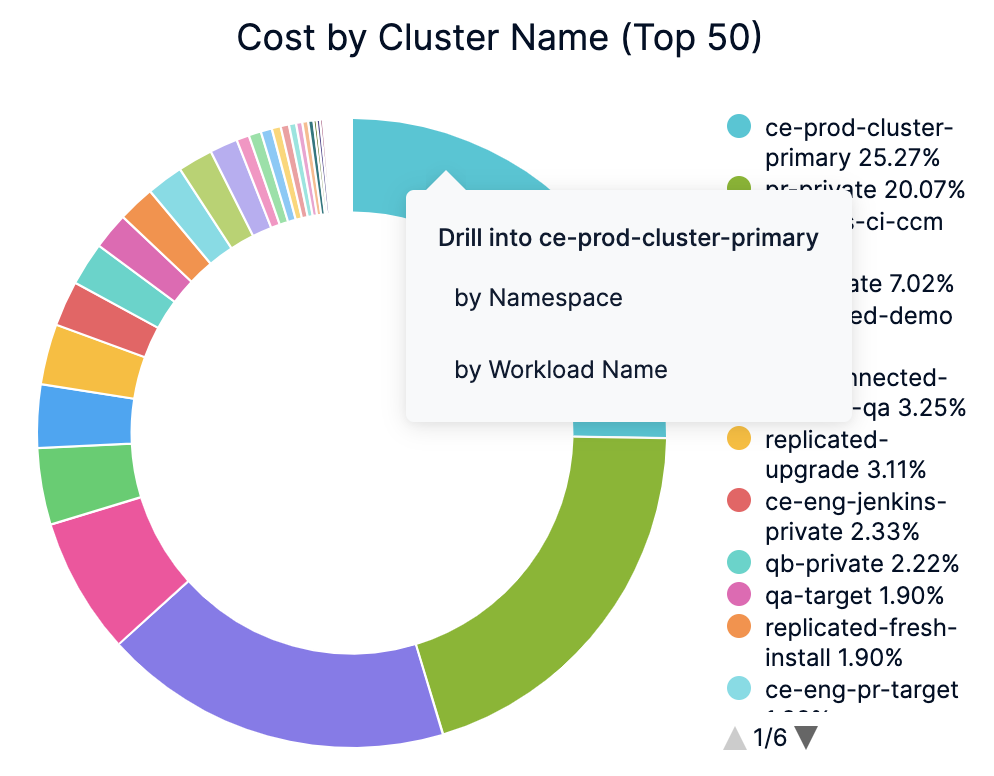 5. In Cost by Cluster Name (Top 50), click the up or down arrow button to scroll up or down the list. The list shows the percentage of each account with respect to the cost contribution.