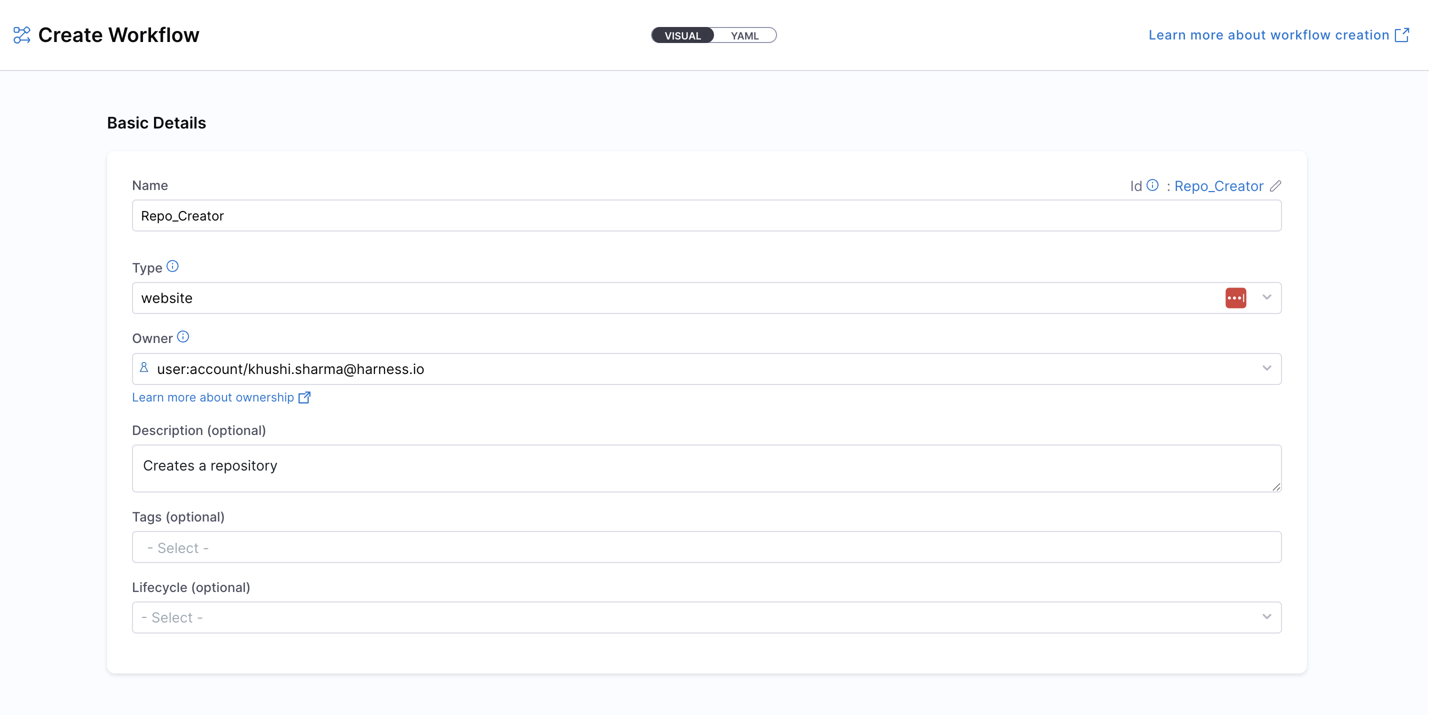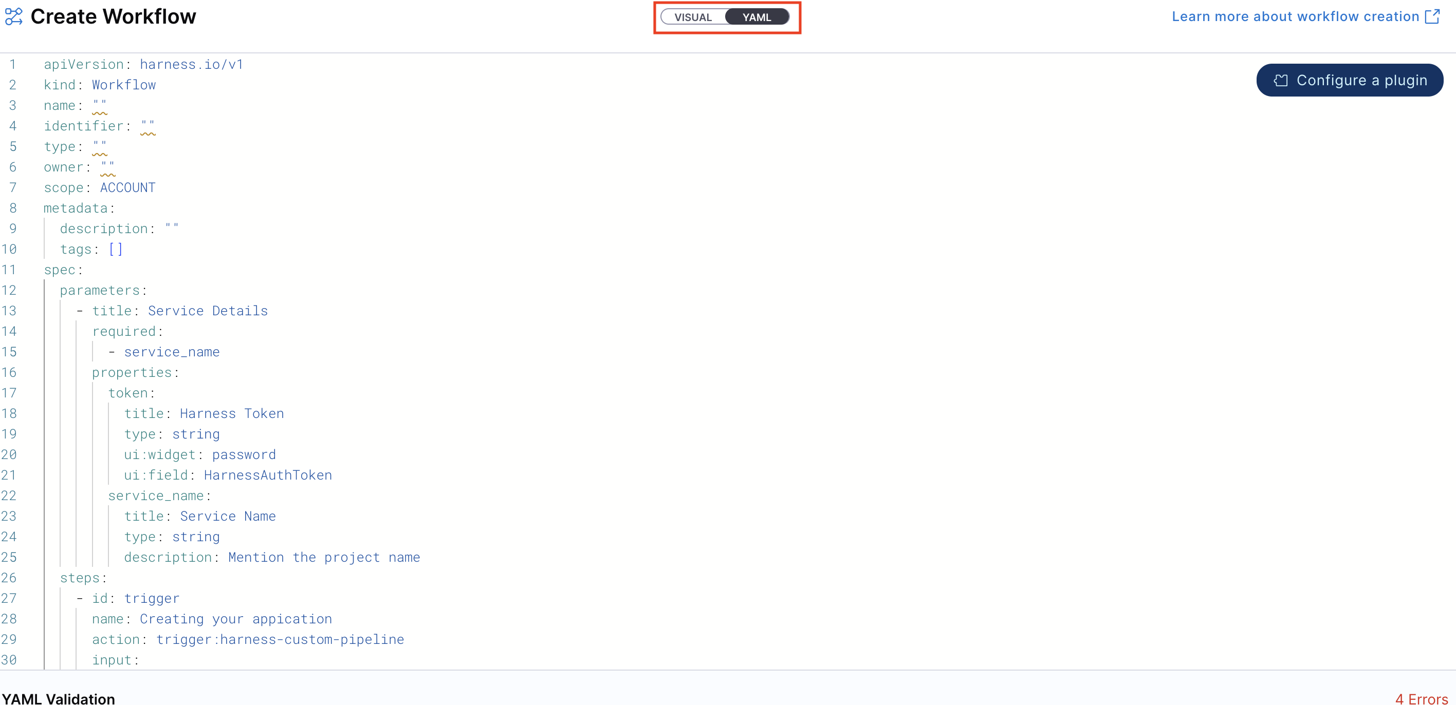 - Enter the required Workflow information. The Visual view is synced in real-time with the YAML view for full transparency.